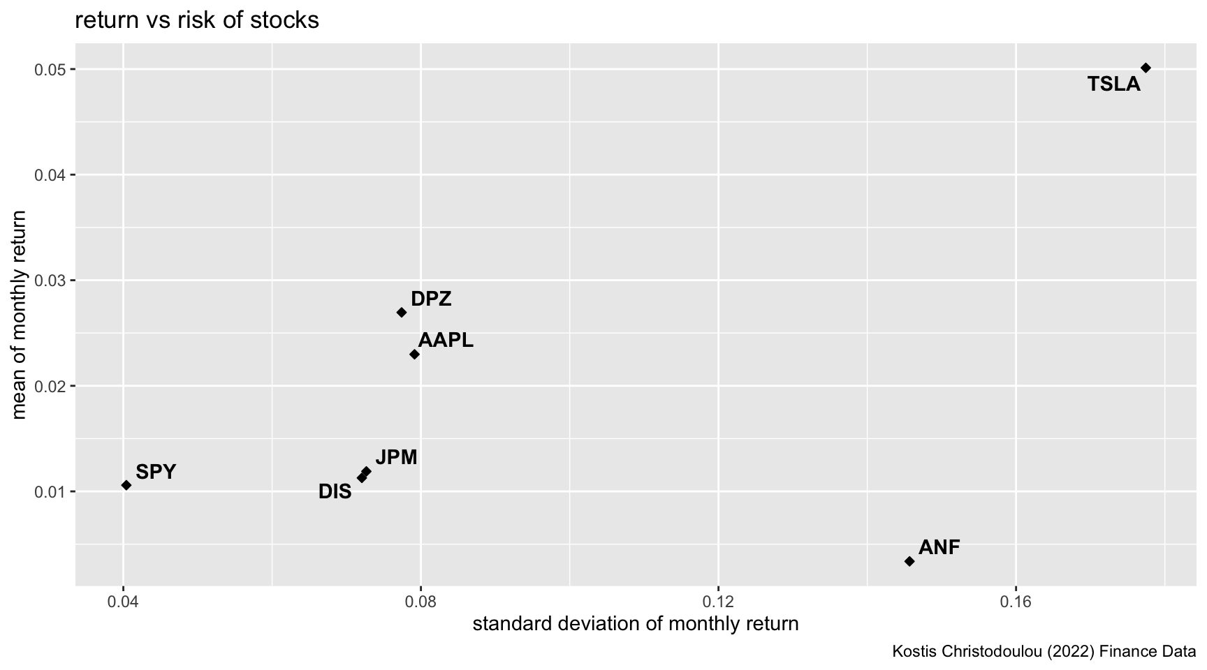 Answer: Standard deviation can be used to show the volatility of the stocks, and therefore the risks beared by the investors. Most companies’ stocks follow the rule of “risk vs return”, which means that those with higher risks should generate higher returns to compensate. For examples, S&P 500 ETF generates less risk for less return whearas Tesla generates extremely high return for high risk. Other stocks similarly follow this rule. However, Abercrombie & Fitch is risky but still provides low returns. This poor performance aligns with the bad news on the company over the recent years, including the declining sales from 2020 to 2022, scandals of discriminatory hiring practices, store closure etc.